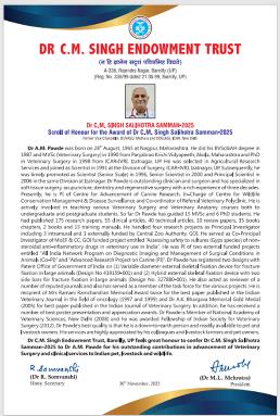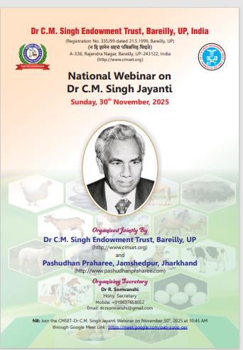Trust Members are requested to update their postal address, designation, email id and mobile number. Updates may be sent to undersigned. Homage on 17th Punya Thithi, 27th July, 2023 Dr Chinta Mani Singh (1922-2005), “Karm Yogi,God Father or Doyen of Indian Veterinary Profession” breathed last, 17 years ago on 27th July, 2005 at Sussex, UK. His memoirs are still fresh and live in heart of most of senior veterinarians of this country, who listened, knew and worked with him. There is a strong need that young veterinarians of this country should know about his life, contributions and achievements for advancement of veterinary profession. Dr C.M. Singh Endowment Trust, Bareilly (cmset.org) works with this mission and welfare of for livestock man and veterinarians. The 30thNovember, 2022 is birth centenary year of Dr Singh. Trust in collaboration with veterinary Institutions of country is celebrating it in befitting manner. Our floral tributes and rich homage to Late Dr Singh. Read More... |