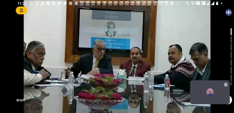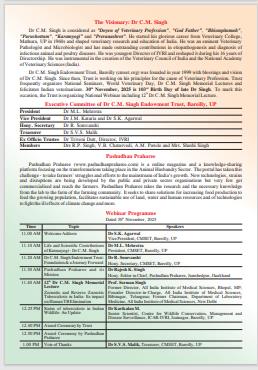 | National Webinar Flyer and programme, 2025 | Vice President CMSET, Dr S.K. Agarwal welcoming speakers, office bearers and scholarly audience | President CMSET, Dr M.L. Mehrotra speaking about the life and achievements of visionary Dr C.M. Singh | Veterinary academicians, scientists and students attending webinar from different parts of country |